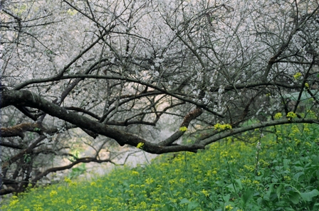 園區中有一區塊的梅樹下種著油菜花,黃花綠葉,襯著鋪滿雪白的天空。