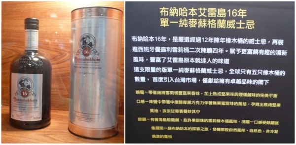 首席調酒師Ian說喝起來會有黑巧克力、果蜜甜味,以及布納哈本位處海邊帶來的淡淡海風鹹味,不過份量實在太少,很難體會耶:p 而在Ian說為了尊重每一年的陳釀,應該讓酒在口中停留16秒的活動前,我早就把"極限量"的酒液吞下肚了!